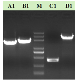 圖:使用本公司3’-RACE方法獲取了不同基因的3’-RACE PCR電泳結果(A1: 大腸桿菌某基因1600 bp,B1: 牡蠣某基因 1800 bp;C1:小鼠某lncRNA 460 bp;銀鯧某基因D1: 2600 bp)