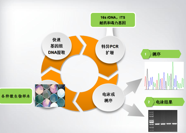 通過對細菌16rDNA可變區和真菌ITS區進行PCR擴增,然后測序和Blast分析,從而獲取微生物種類的準確鑒定;同時對多種微生物特異的毒力基因以及耐藥基因進行PCR擴增,進行致病菌株以及耐藥菌株的精確篩選。