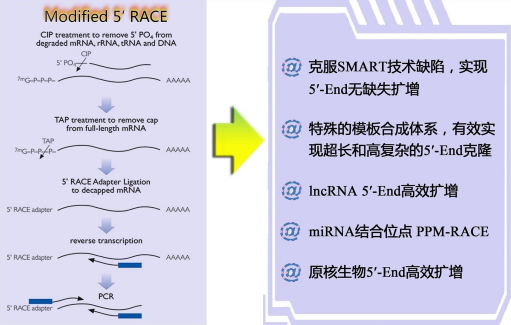 (1) 修飾的5’-RACE技術:在經典5’-RACE基礎上,進行了諸多改進,如加入增強劑,選取耐高溫、高效逆轉錄酶,以及縮短每步RNA沉淀過程,減少RNA降解等方式,有效實現了超長、特殊結構5’-RACE片段的獲取;